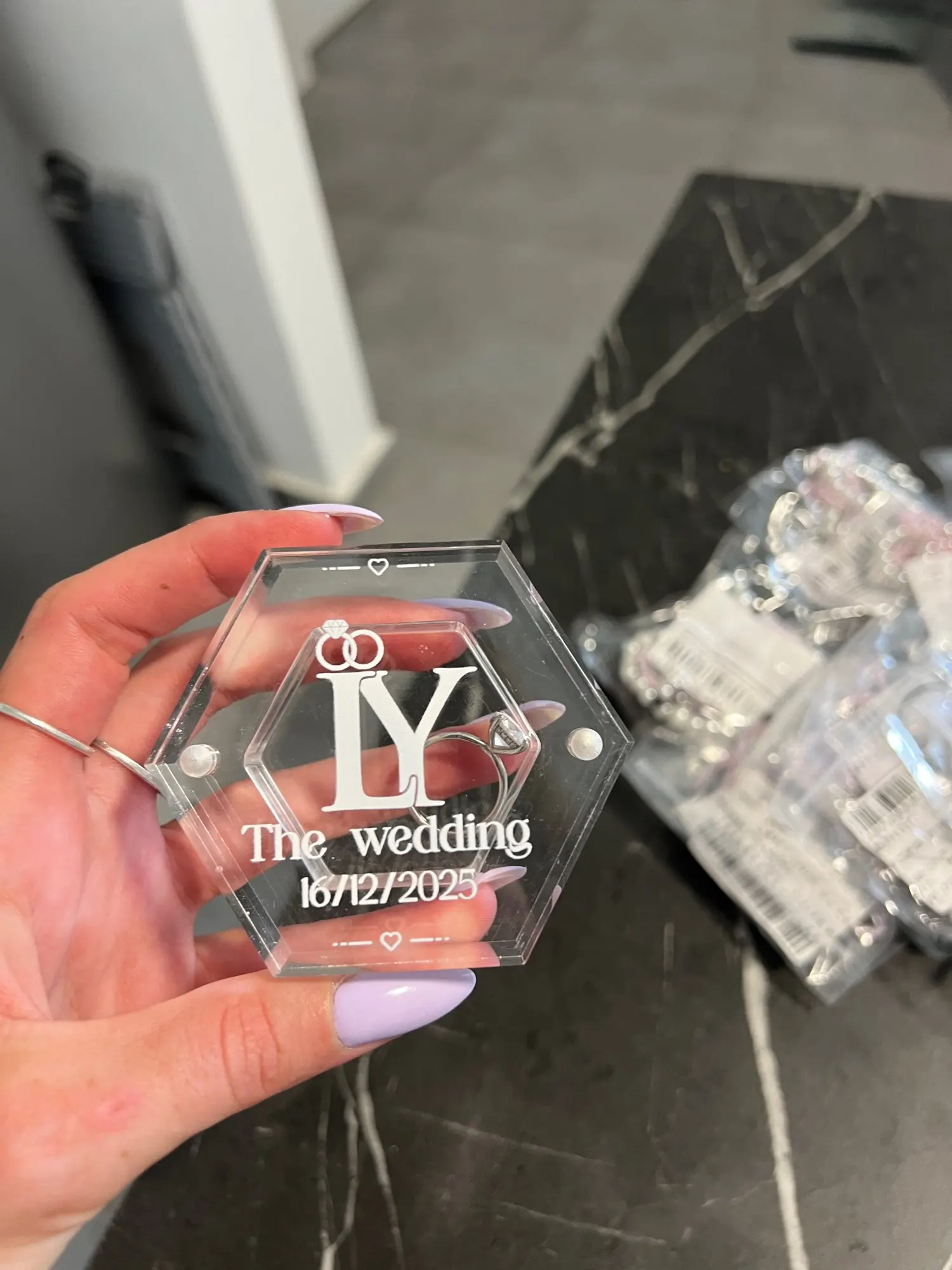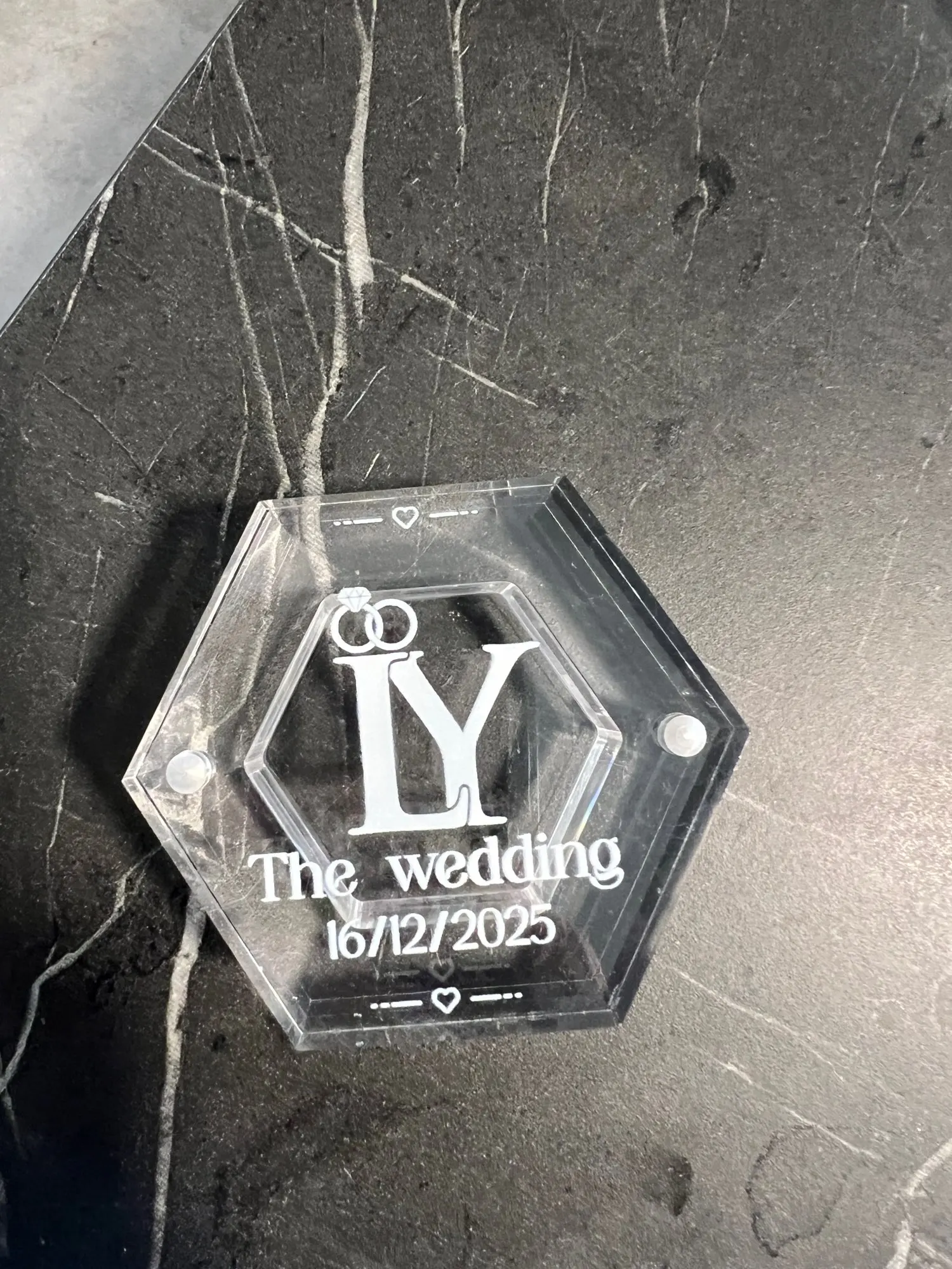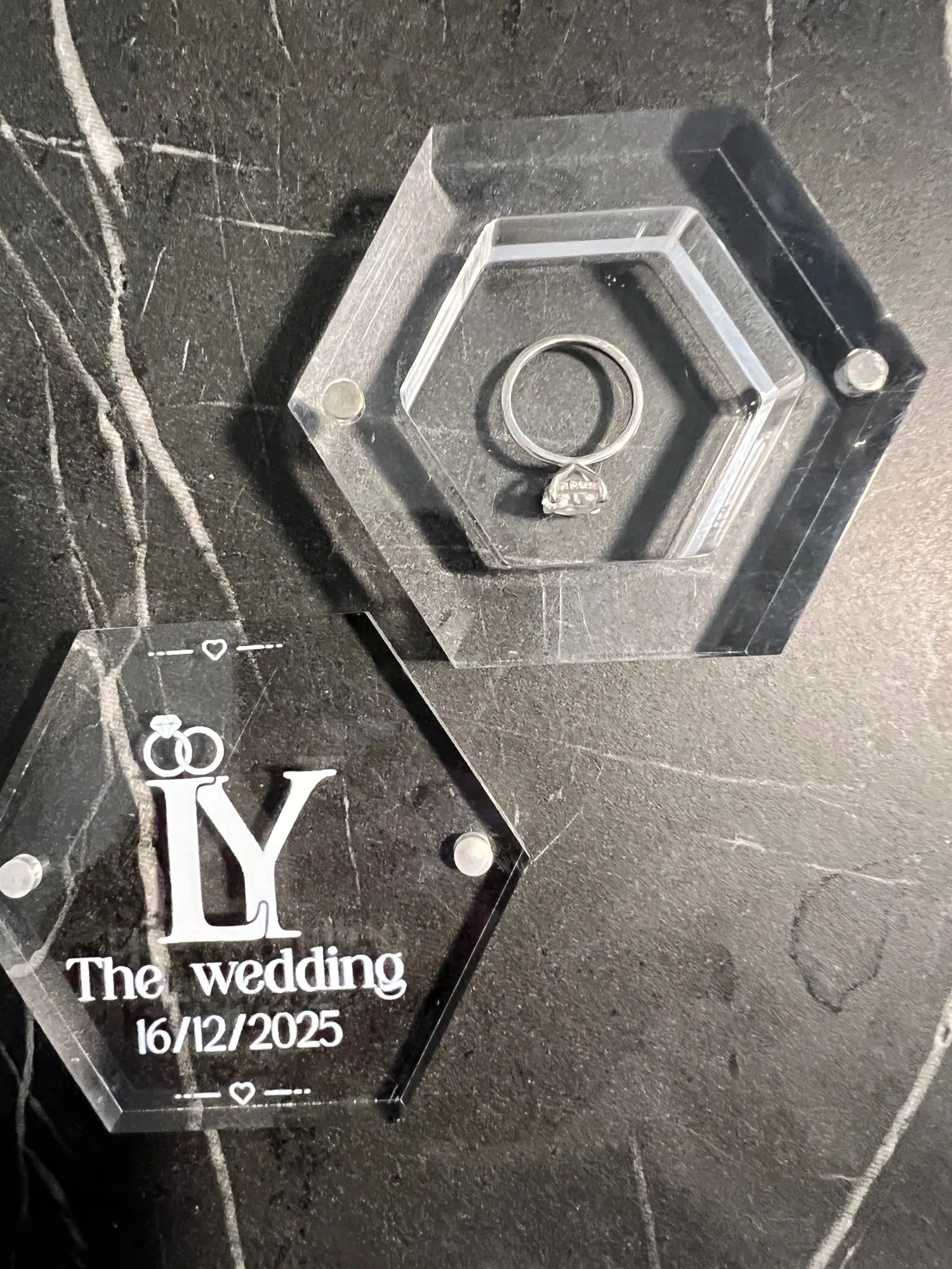 Add an elegant touch to your special day with our Custom Acrylic Clear Hexagon Ring Box. Crafted from high-quality acrylic, this sleek and transparent design is the perfect way to store and showcase your wedding or engagement rings.