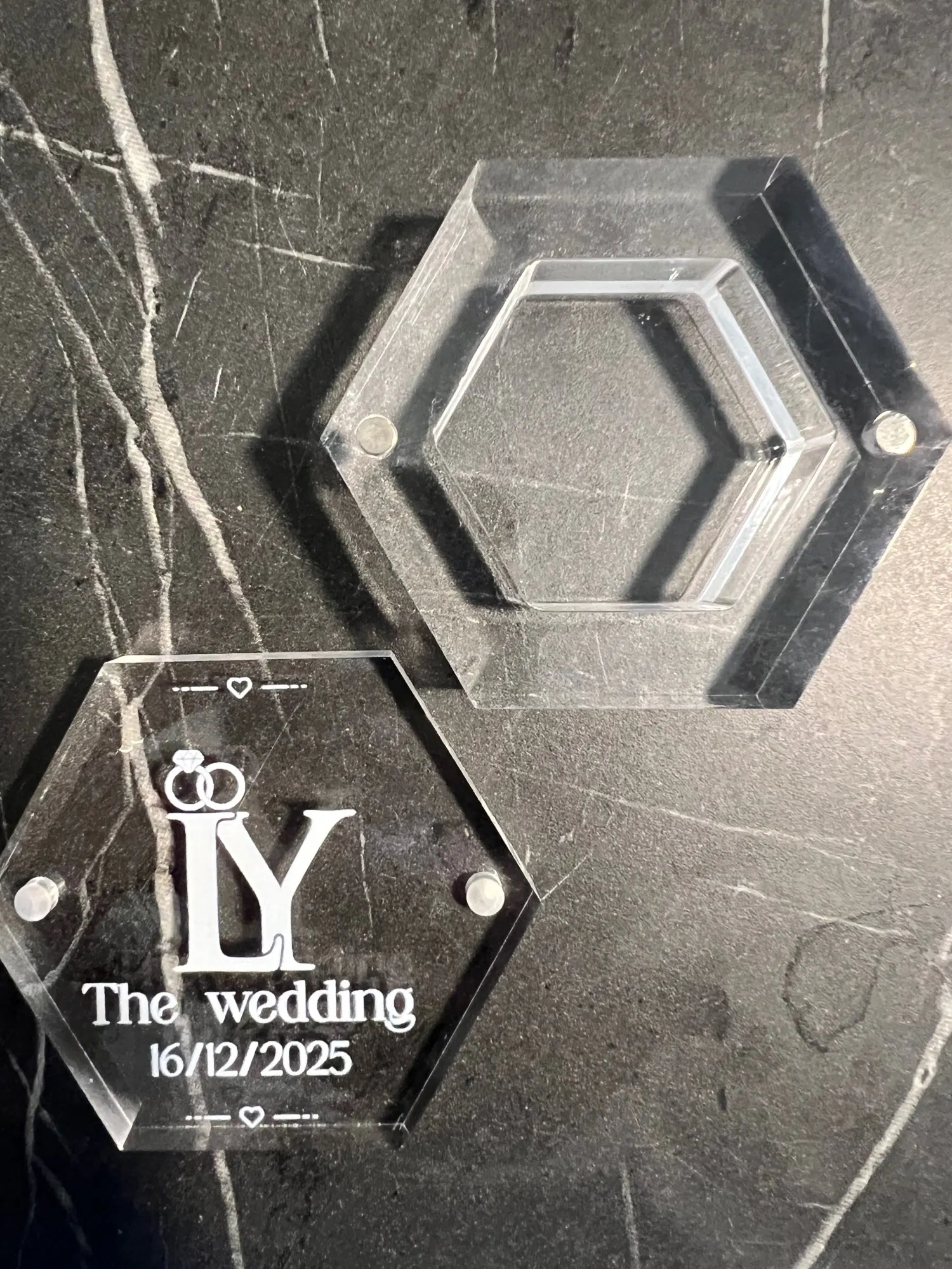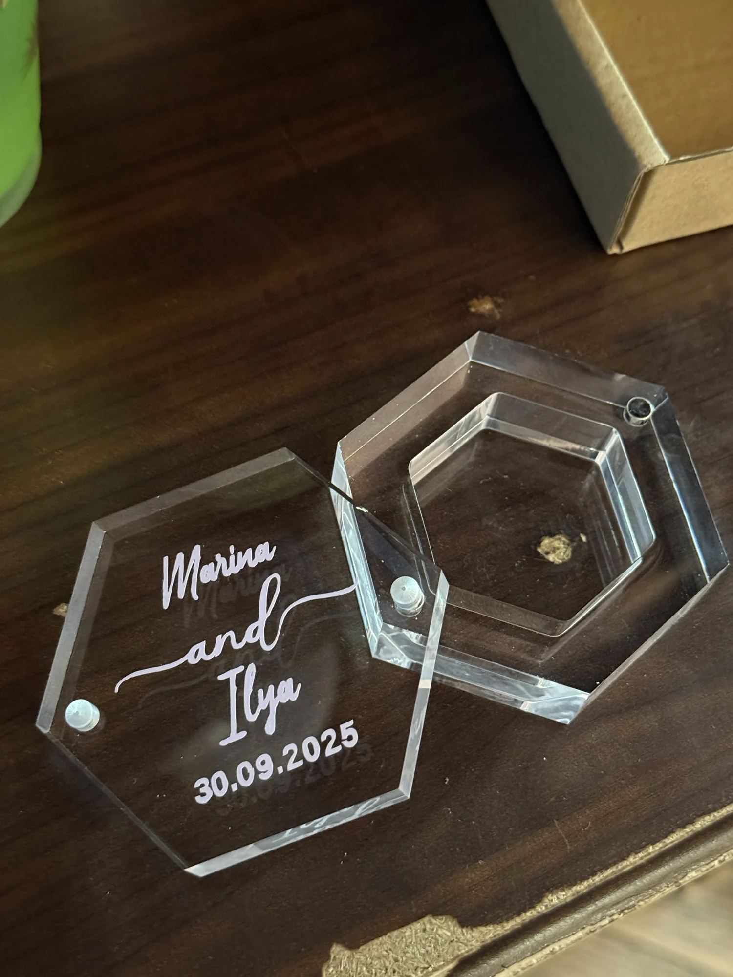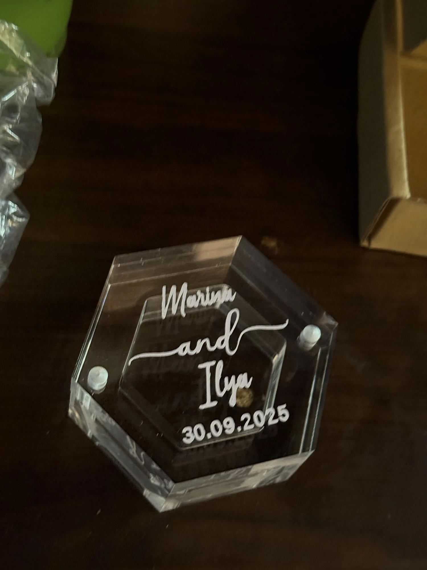 Add an elegant touch to your special day with our Custom Acrylic Clear Hexagon Ring Box. Crafted from high-quality acrylic, this sleek and transparent design is the perfect way to store and showcase your wedding or engagement rings.