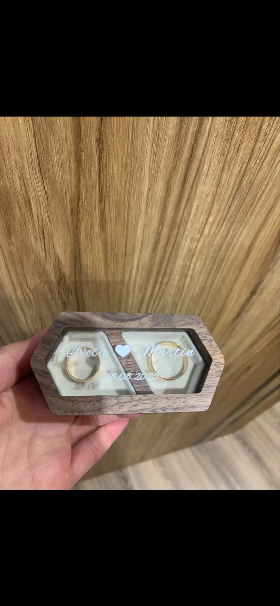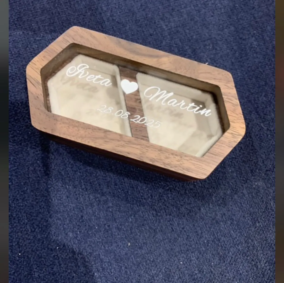 Unveil the elegance of our personalised walnut wooden ring box, meticulously designed to hold your precious rings with sophistication and charm. Crafted from high-quality walnut wood, each box is a timeless piece of art, customizable with names, dates, or special messages to immortalize your most cherished moments. As you gaze through the clear top, envision your rings beautifully displayed, safe and sound within the soft interior lining. Perfect for weddings, anniversaries, or as a heartfelt gift, this ring box is a celebration of love, durability, and personalization. Embark on a journey of everlasting memories with our exquisite ring box—where each ring finds its special place.